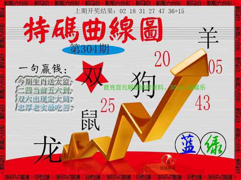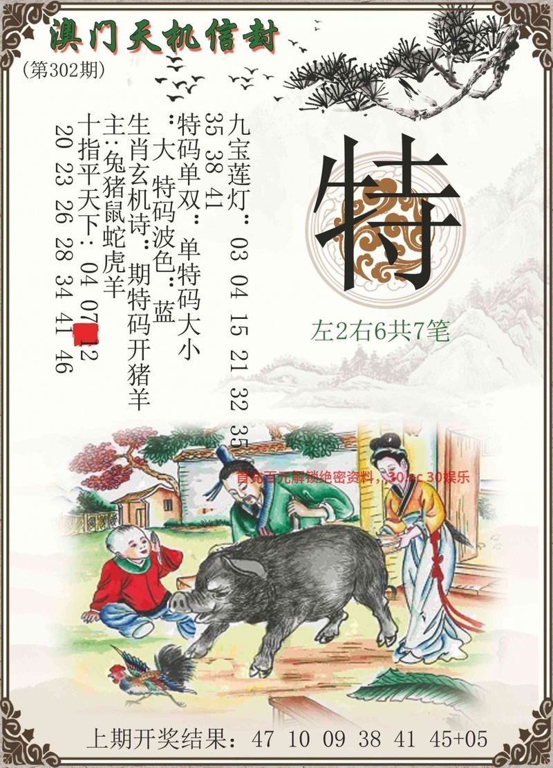 303期芳草玄机:一帆风顺蛇虎午,沾亲带故取蓝红。异想天开七月七,数一数二金肖来。狗拿耗子三更天,龙虎争一伴二七。狗撵兔子势凶残,春秋一轮左右开。 芳草诗:山边树林一行行,迎风遥相望无边。大雁南飞择木柄,先锋已过玉门关。 传奇特肖:羊兔狗马鼠鸡龙 内幕头数:130 |