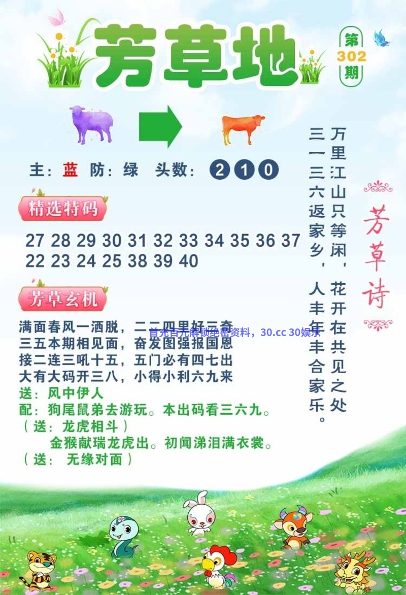 302期芳草玄机:满面春风一洒脱,二二四里好三奇。三五本期相见面,奋发图强报国恩。接二连三吼十五,五门必有四七出。大有大码开三八,小得小利六九来。 芳草诗:三一三六返家乡,人丰年丰合家乐。万里江山只等闲,花开在共见之处。 传奇特肖:鸡龙马猴猪鼠兔 发财波色:蓝绿 内幕头数:210 |