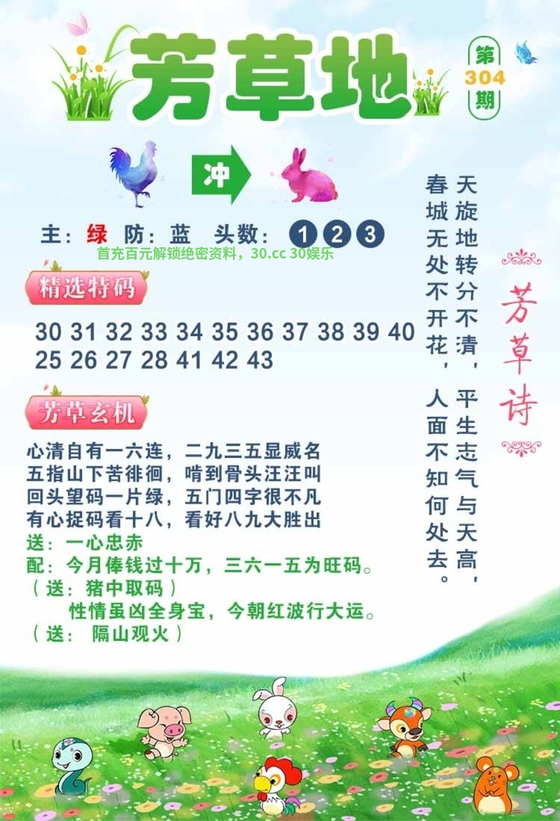 301期芳草玄机:八九五开出特码,十三十四兄弟码。新枝叶才五七片,偷走三八藏二ー。猪哥牛弟来相处,平安无事马闲坐。横财就手君别急,人心不足蛇吞象。 芳草诗:猪前虎后三位博,本期四二不老松。虎头蛇尾要值钱,壮观东南一四州。 传奇特肖:马牛狗鸡兔龙鼠 发财波色:绿蓝 |